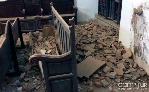 El derrumbe se ha producido en uno de los laterales de la parte trasera de la iglesia, zona que ahora se encuentra llena de cascotes y cubierta d polvo. Lo que era una grieta en la bóveda se ha convertido en un gran agujero que deja ver parte del techo, el cual fue arreglado hace unos años por lo que no se ha derrumbado.