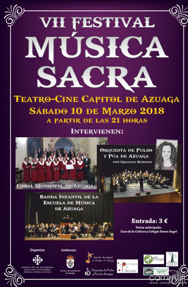 El próximo sábado, 10 de marzo, Azuaga acoge la celebración del VII Festival de Música Sacra, organizado por la Cofradía de Ntra. Sra. de la Esperanza, Ntro. Sr. De la Humildad y Paciencia y Oración en el Huerto.